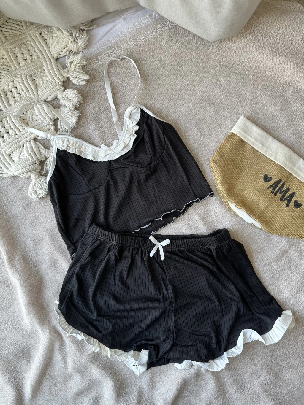 Pijama de dos piezas, tela elastizada, musculosa con detalles en vuelo y breteles regulables, corto con elastico en la cintura y detalles en vuelo. Vienen por talles: S/M y en L/XL